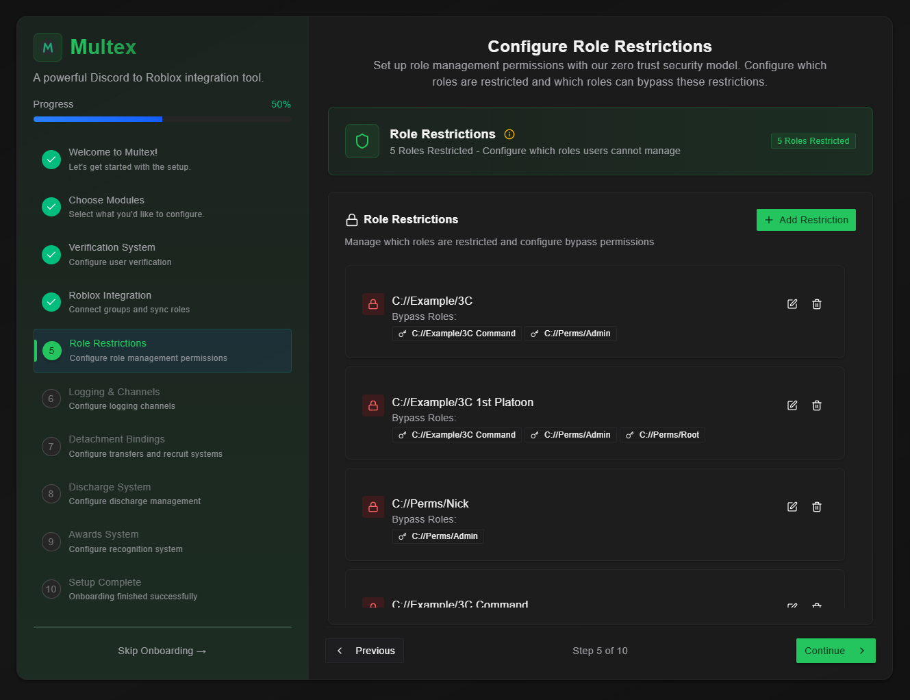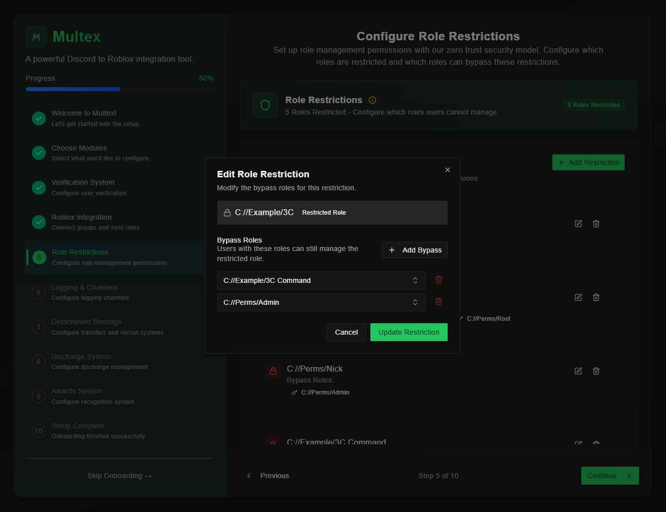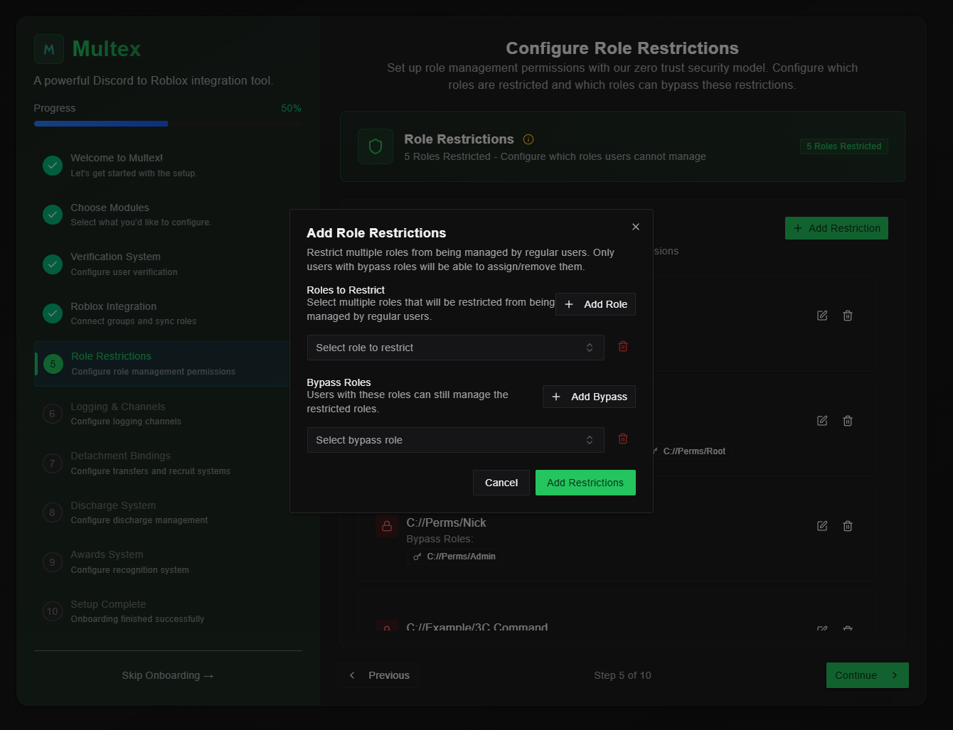 /roles discord) the target restriction - Click Add Restrictions - Save the configuration to activate the bypasses
